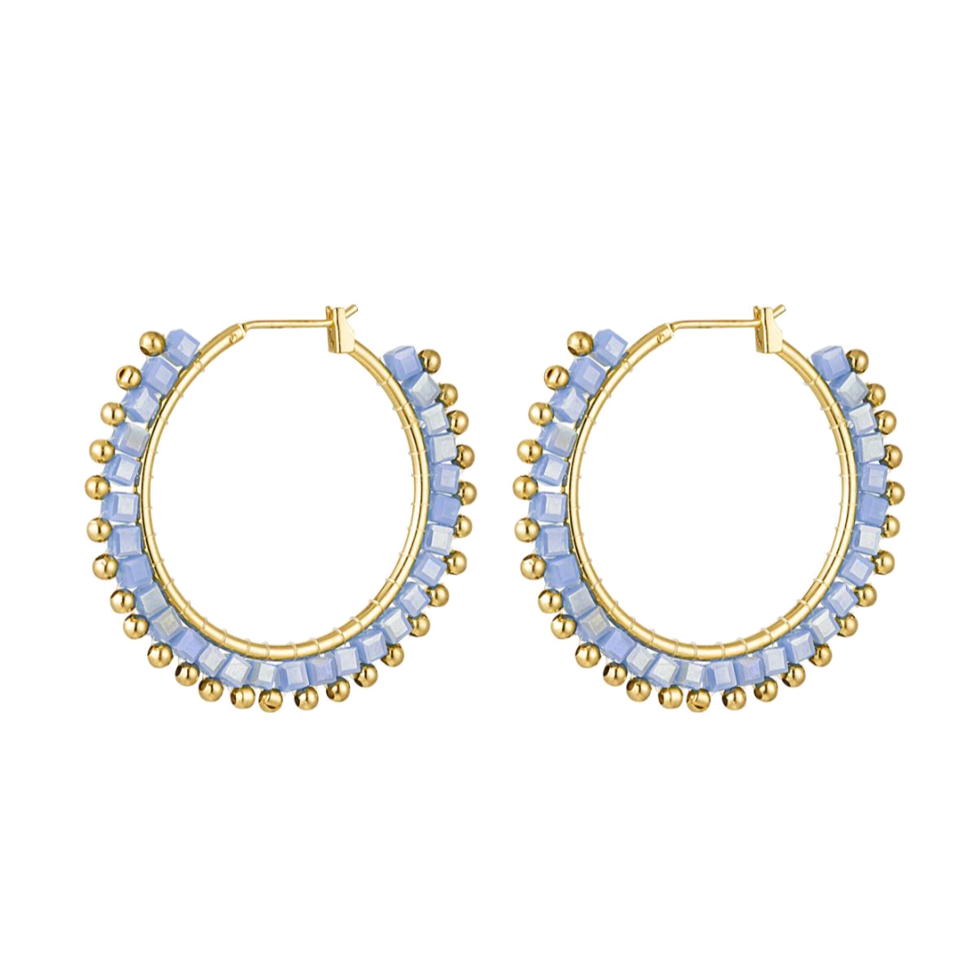 Hoe leuk zijn deze ronde oorbellen met blauwe vierkante kralen en goudkleurige dots! Superleuk om deze oorbellen te combineren met kleine gouden ringetjes of oorknopjes, perfect voor een feestje. De oorbellen zijn gemaakt van koper en kristalkralen en hebben een afmeting van 3,6 cm.