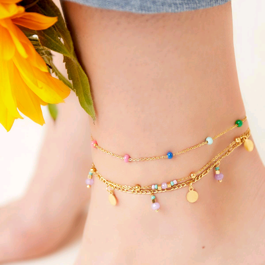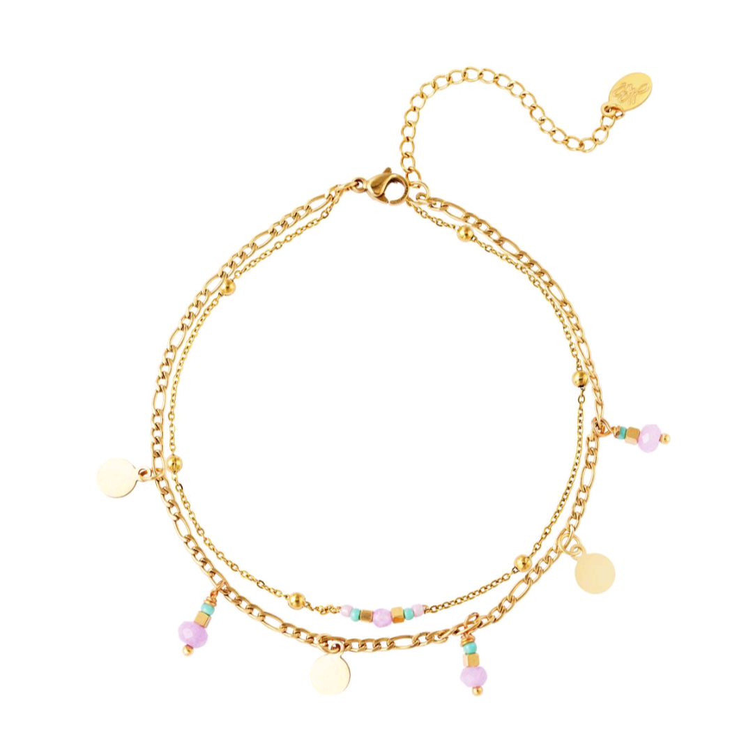 Dubbel gelaagd enkelbandje met kleine kraaltjes en bedels. Gemaakt van roestvrij staal en verkrijgbaar in goud met roze, paarse of blauwe details.