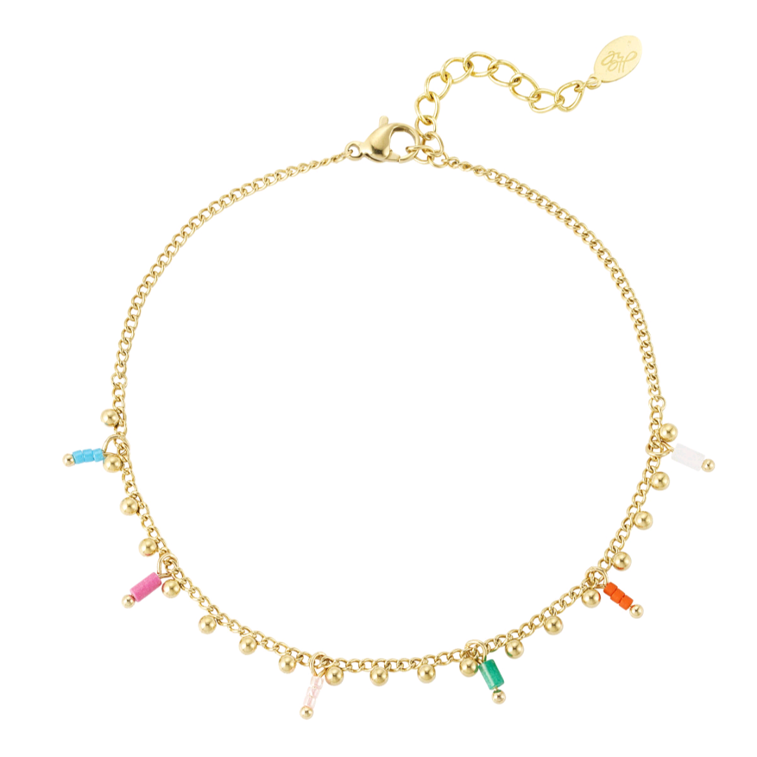 Wauw! Check nu deze prachtige gouden sierlijke enkelband met glaskralen! Geef je enkel een upgrade met onze prachtige enkelbanden! Gemaakt van stainless steel en glaskralen. De afmeting van de enkelband is 22 centimeter en kun je met 5 centimeter verstellen.