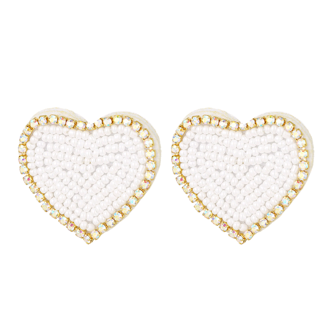 Hoe leuk zijn deze kralen oorbellen in de vorm van een hart met strass in de kleur wit. Deze oorbellen zijn superleuk als statement oorbellen te dragen en maken jouw outfit helemaal compleet! De oorbellen zijn gemaakt van glaskralen, Stainless Steel, strass steentjes en stof en hebben een afmeting van 6 cm.