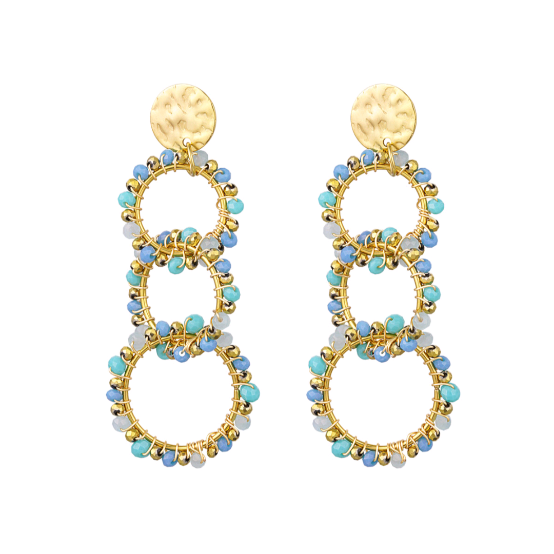 Statement alert!! Ben jij net als ons helemaal verliefd op deze prachtige gouden creolen met 3 blauw kleurige kralen ringen! Van deze oorbellen word je toch meteen vrolijk! Daarnaast zorgen deze oorbellen ervoor dat jij een prachtige erecatcher draagt! Je kunt de oorbellen perfect combineren met meerdere blauw kleurige sieraden, accessoires en kleding! De oorbellen hebben een speelse uitstraling en zijn gemaakt van Stainless steel in combinatie met kristalkralen. Daarnaast hebben de oorbellen een lengte van 6 cm, een echt statement paar oorbellen!