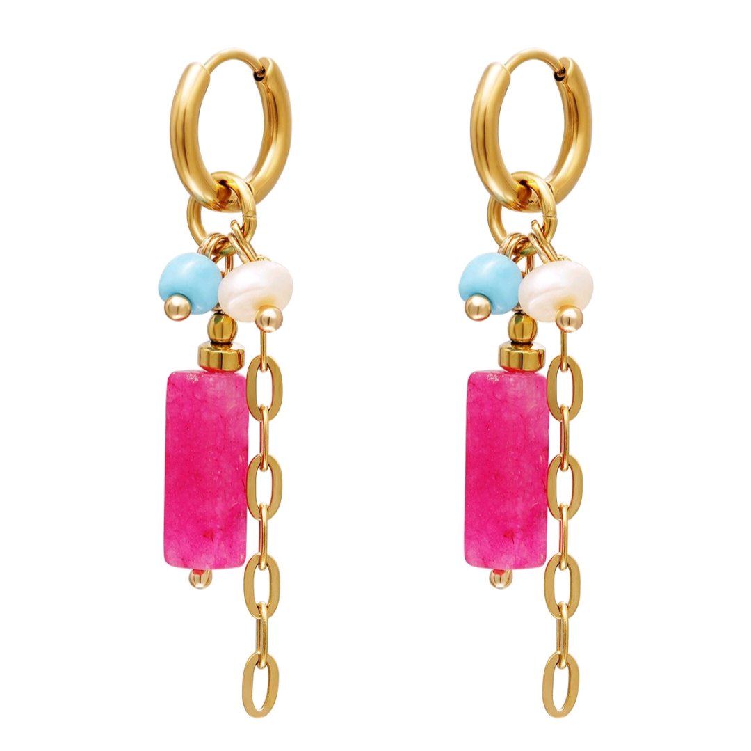 Oorbellen rechthoekige steen en kraaltjes - fuchsia
