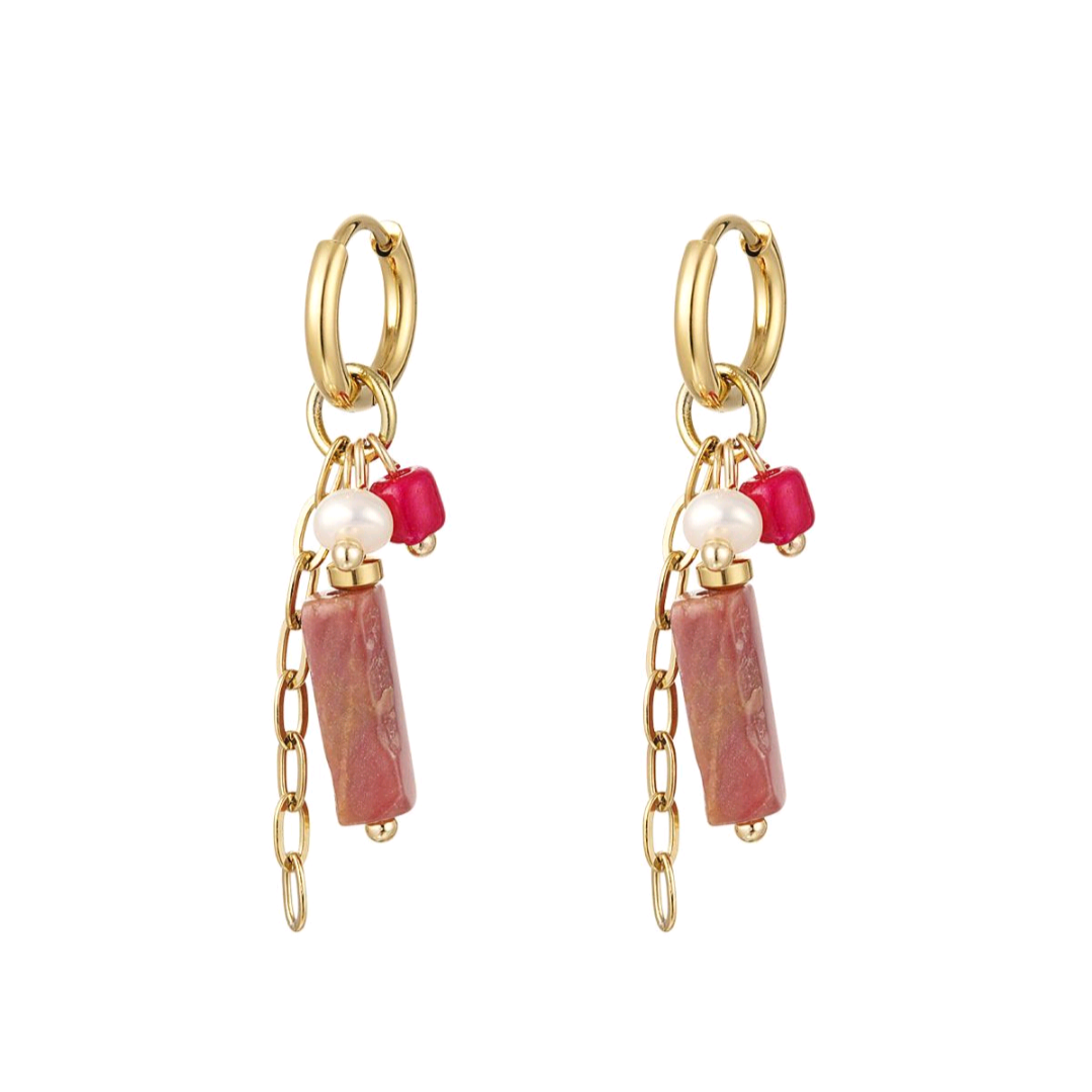 Hoe leuk zijn deze oorbellen met roze rechthoekige steen en kraaltjes voor het najaar! De oorbellen zijn gemaakt van stainless steel, hematiet, glaskralen, parels en steentjes. De oorbellen zijn 4,5 cm lang en perfect te combineren met meerdere gouden oorbellen.