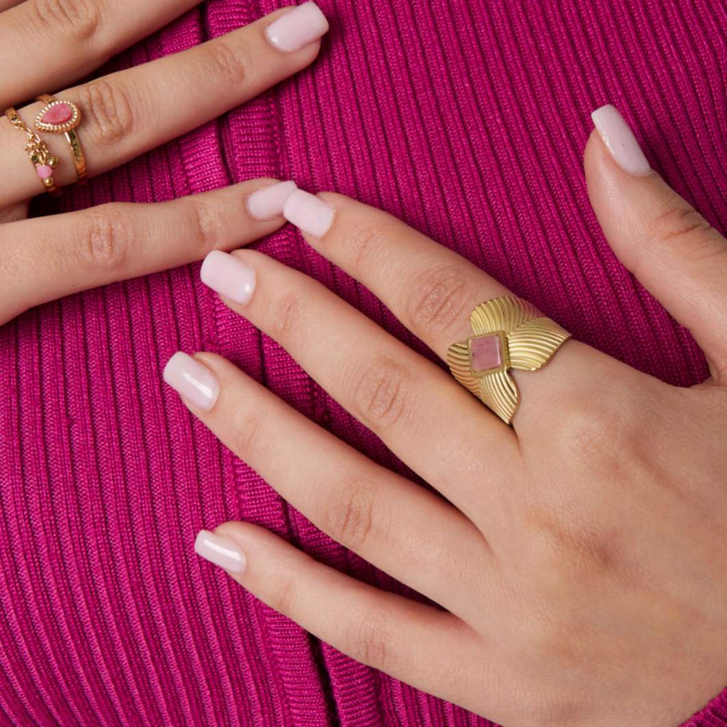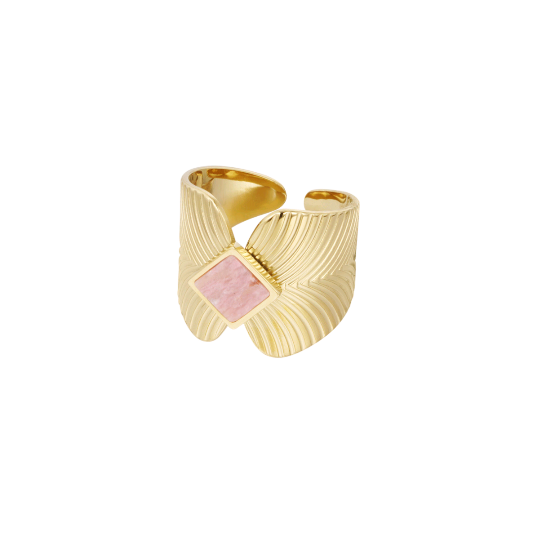 Ben jij op zoek naar een trendy goude ring? Dan is deze gouden ring met blaadjes print en roze steentje in de vorm van een ruitje echt iets voor jou! De ring is mega trendy en daarnaast perfect te combineren met meerdere matchende ringetjes! De ring is gemaakt van stainless steel en steen en is one size. Doordat de ring one size is, kun je de ring ideaal naar elke vorm van jouw vingers buigen. Verkrijgbaar in de kleuren groen, zwart en roze.