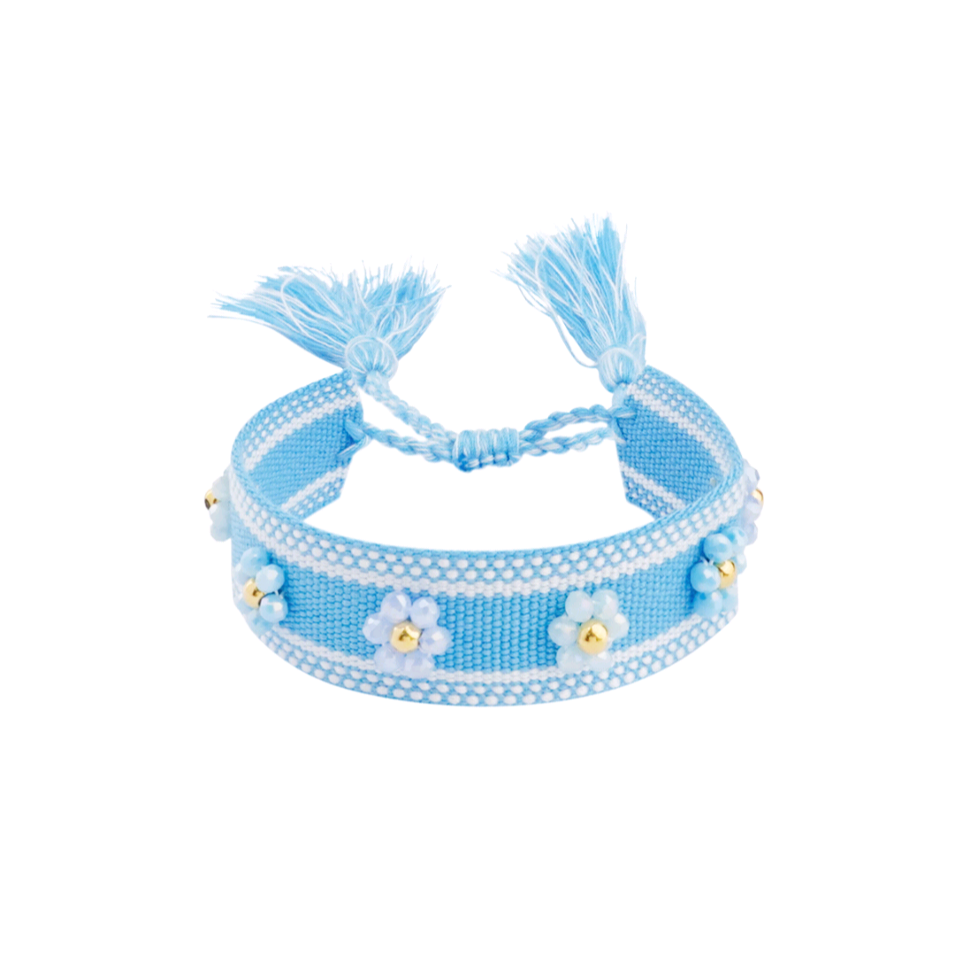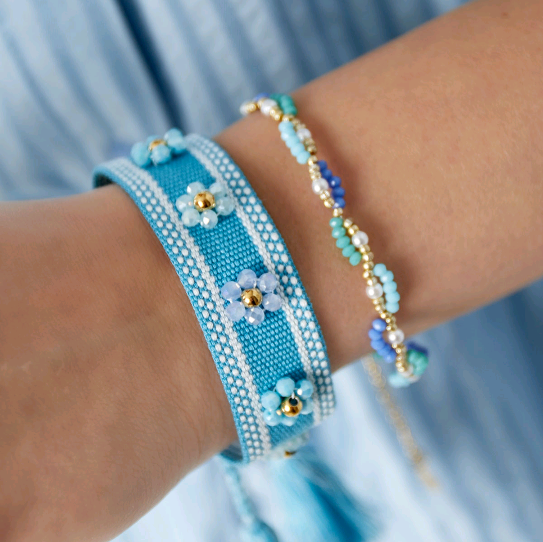 Hoe schattig en leuk voor de zomer is dit stoffen armbandje? De armband is gemaakt van polyester, glaskralen en stainless steel en kan je strakker maken door aan de touwtjes te trekken.