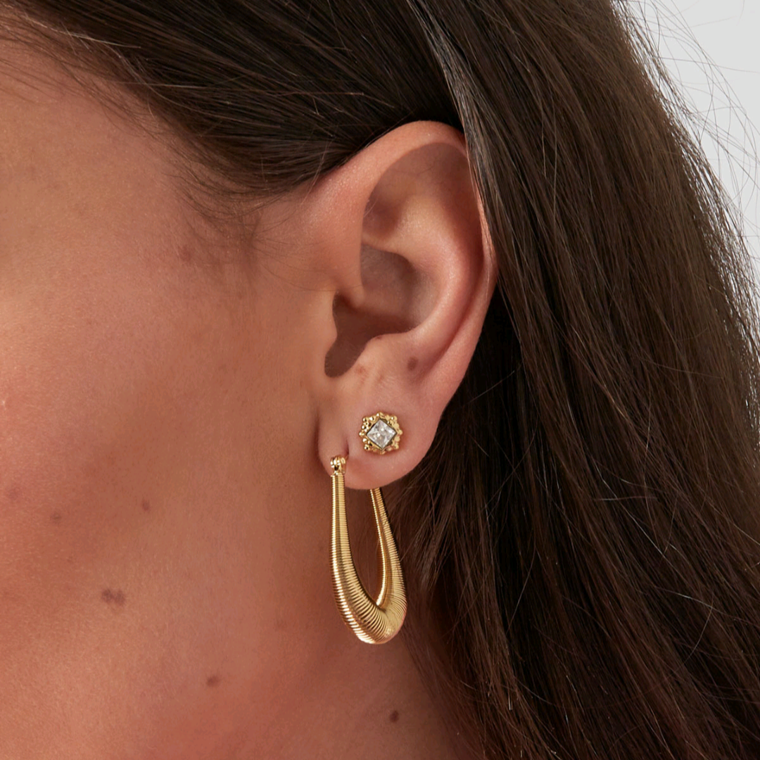 De oorbel is in het goud en zilver verkrijgbaar en is gemaakt van Stainless Steel